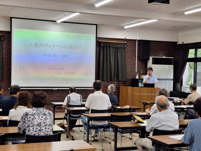 9月24日、「人生のフィナーレに向けて~終活・遺言・相続~」と題し、豊岡公証役場 公証人 江原幸紀氏に講義をしていただきました。講義の前半では、日本人の健康、寿命、年齢別人口構成などの社会状況について資料交え丁寧にとてもわかりやすく説明をしていただき、私たちのおかれている状況を理解することができました。後半は、公証人としての数々の相談内容の事例をお話しいただきながら、具体的な終活、老後の財産管理、相続、遺言をめぐる状況についてわかりやすく説明いただきました。受講された方々は実際の生活と照らし合わせながら、今後具体的にどのようなことから始めたらよいか考えられたようで、大変有意義な時間となりました。