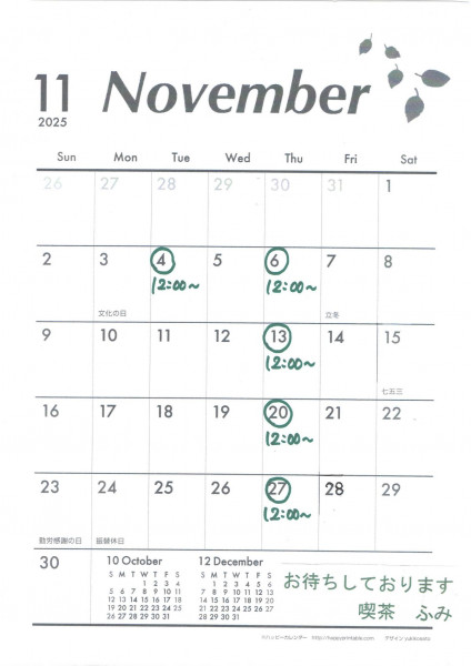 「喫茶 ふみ」 11月の営業日
