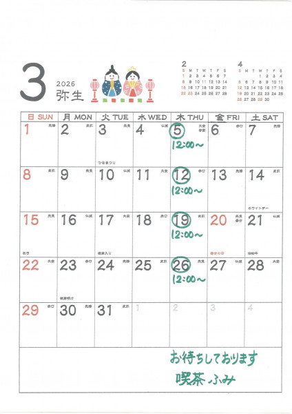 「喫茶 ふみ」 3月の営業日