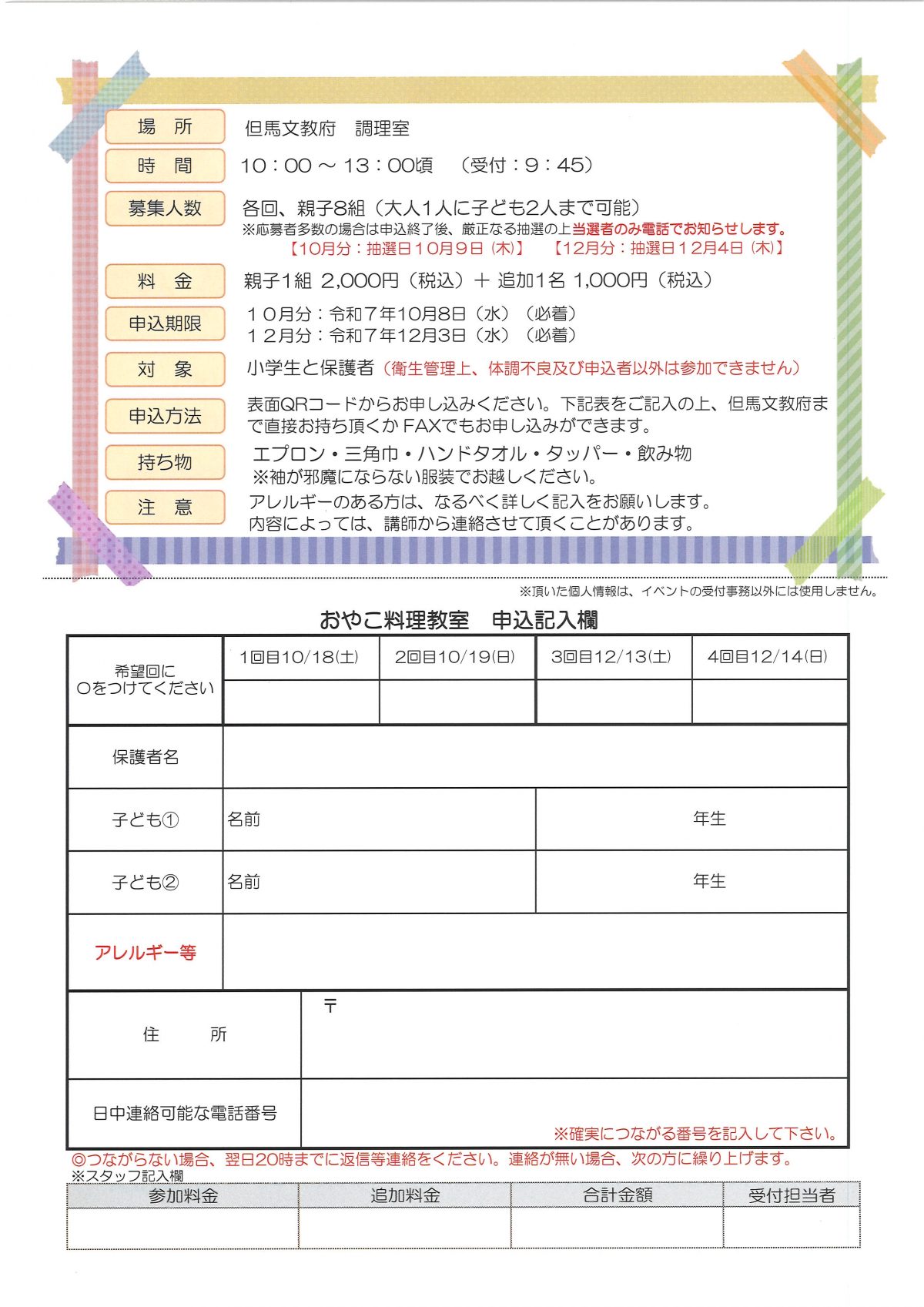 その他 | おやこ料理教室に関するチラシはダウンロードできます。 申込はチラシ表面にあるQRコードからお申し込みください。または、裏面の申込表にご記入のうえ文教府までお届けください。(FAX可) |